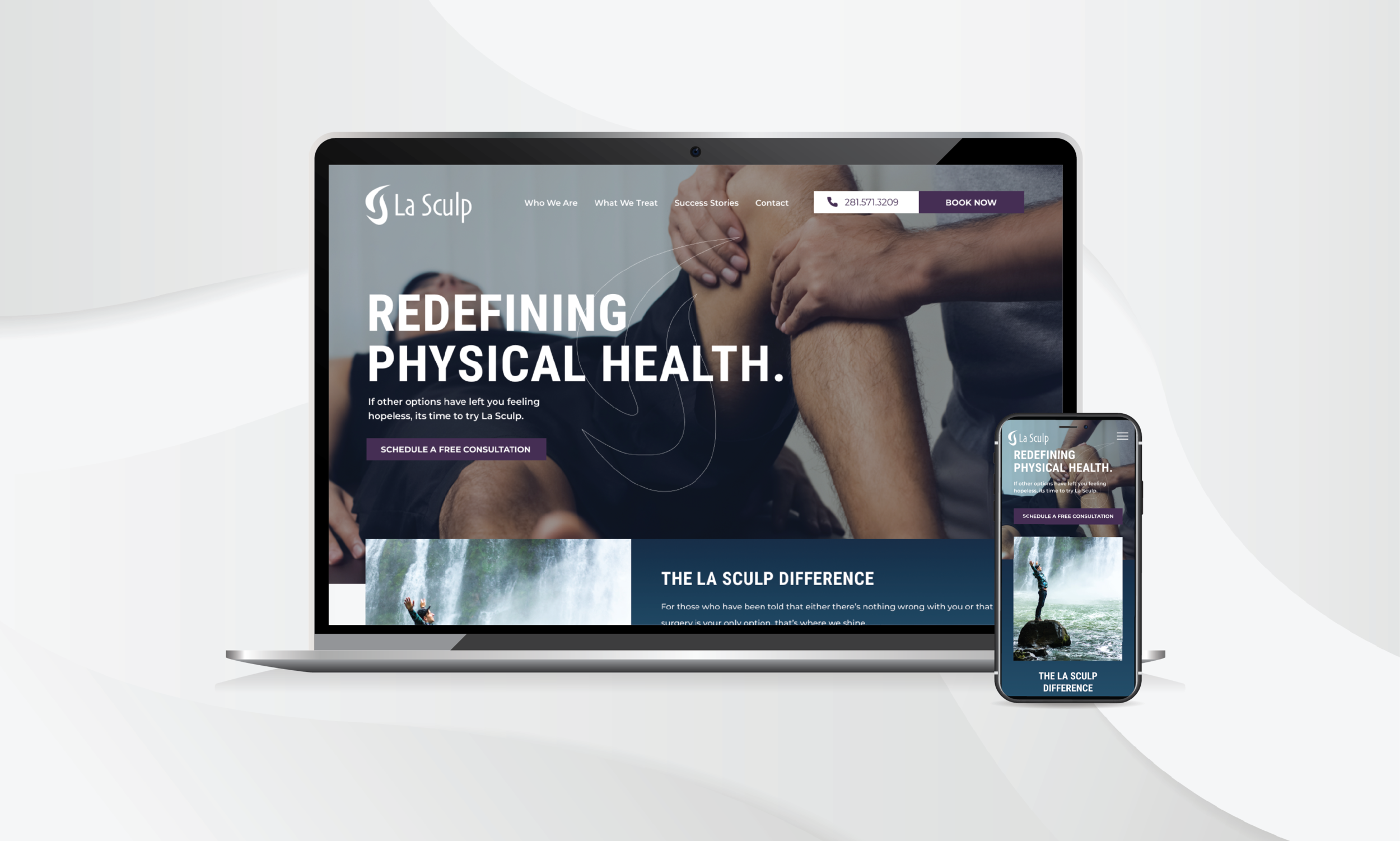 The challenge for the La Sculp branding was to illustrate the diverse array of services they offer and speak to their very broad target audience. Their clientele ranges from a professional athlete looking to recover from a torn ACL, to a housewife looking to reduce her wrinkles and cellulite, to a medical professional looking to purchase a new device for their office. A key take away from the discovery session with the client was when they said, “we sculpt the body like an artist sculps a piece of marble. We fix broken scars, ligaments, backs, broken bones, faces, skin, and sculpt them into something strong, beautiful, and healthy.” Taking this idea, we drew inspiration from various sculptural structures and forms when it came to the logo mark. We wanted to steer away from a med-spa feel, and instead focus on the companies forward-thinking approach and use of innovative technology. While we wanted to display the company as modern and cutting-edge, we still wanted them to come off as friendly and accessible. The resulting mark is strong and sharp without being severe. The colors are more friendly than serious, and the way they are used illustrates the transformation clients can expect from going to La Sculp.